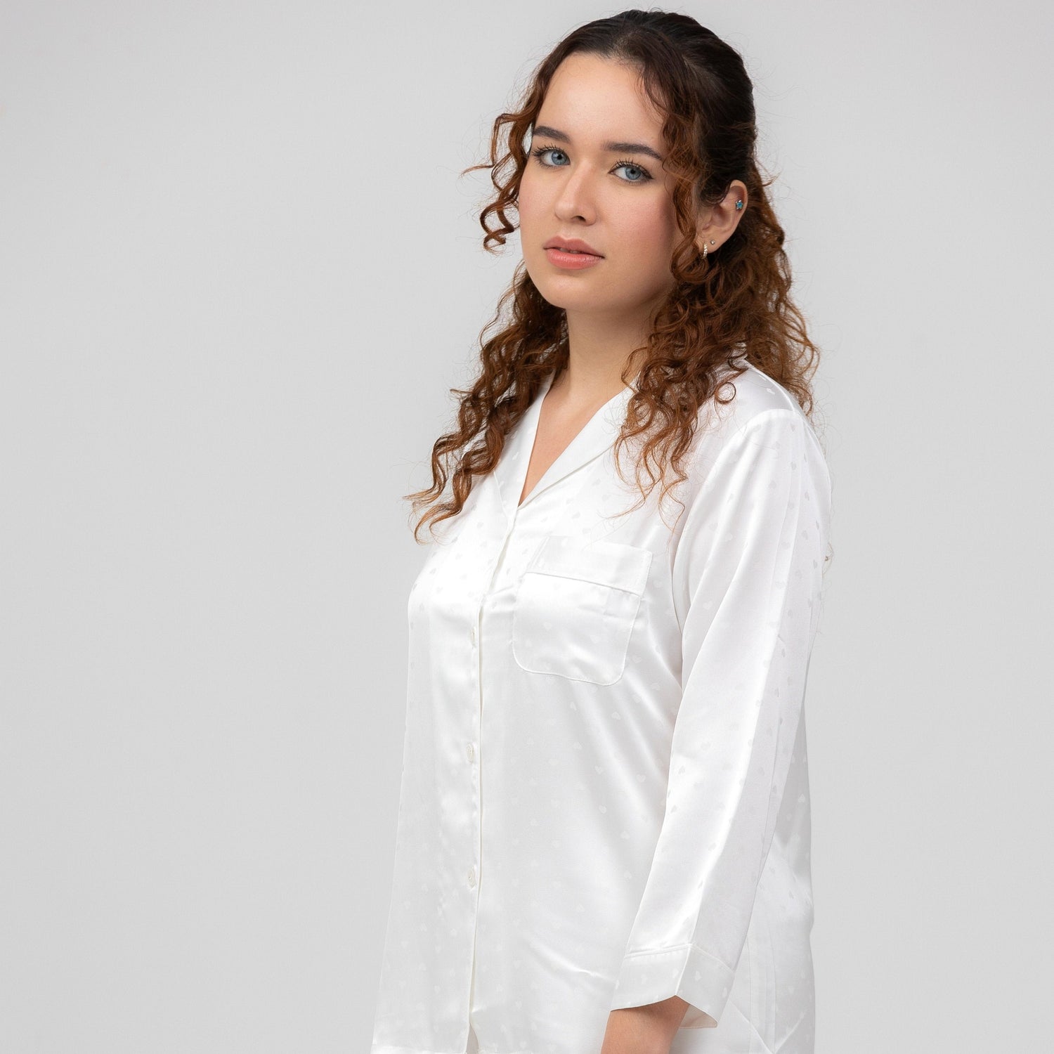 This silk loungewear set includes a top and bottom, meticulously crafted from the finest silk for an effortlessly chic look. The long-sleeve top features a relaxed fit, falling gracefully below the hips, and comes with a handy chest pocket. To add a touch of sophistication, each button is adorned with subtle rhinestones, while a small heart motif gives the set a playful charm.